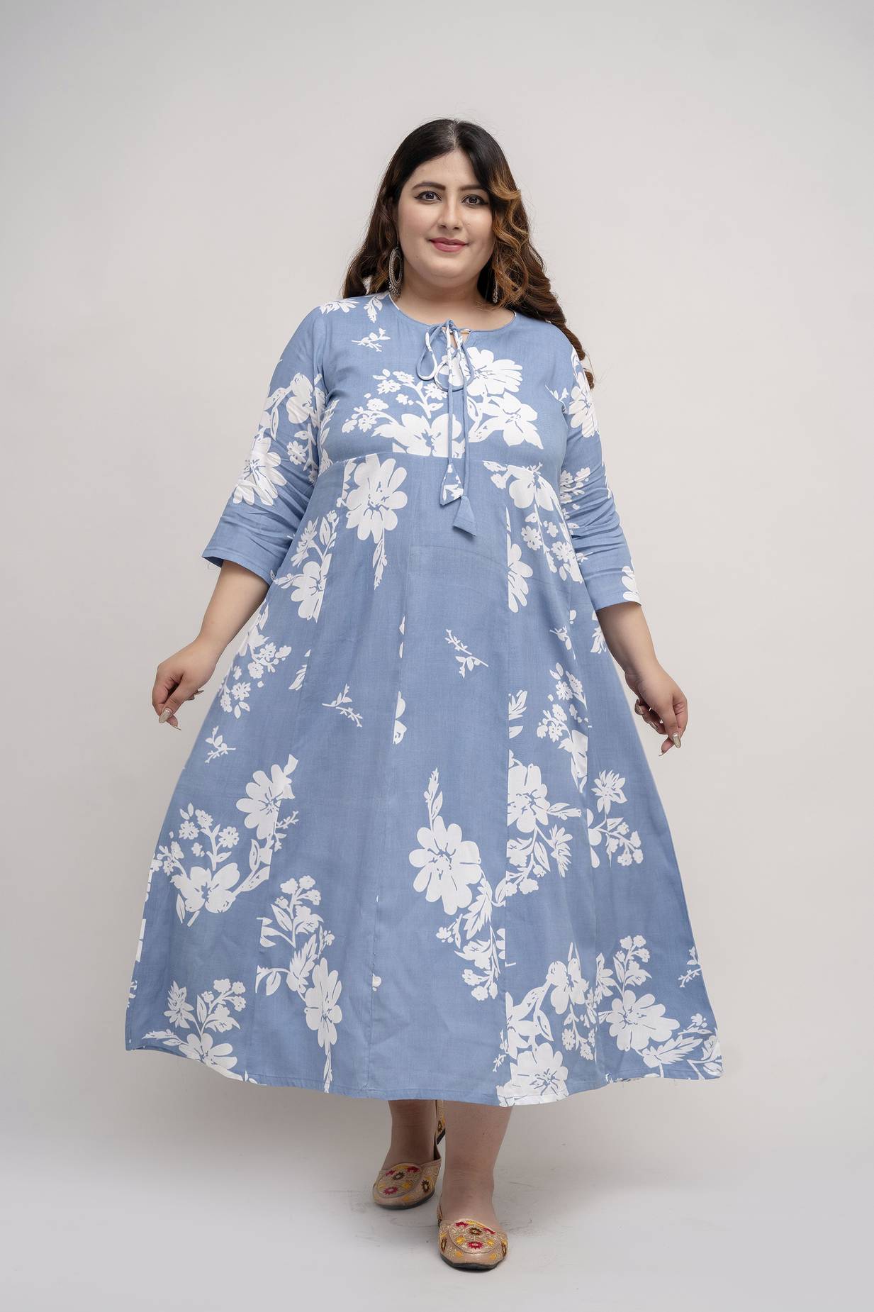 Its flowy A-line silhouette drapes beautifully over your curves without clinging. The stylish tie-up neckline with tassels and 3/4th sleeves add just the right amount of charm and comfort. Whether you're heading to a casual lunch, running errands, or relaxing at home—this gown is your go-to for effortless style.
