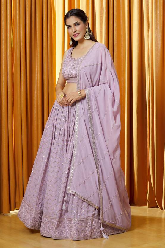 Lehenga made with Georgette Fabric with a large 4 meter flair with cotton lining (inner) It can be fit up to the waist 42 inches and height (waist to floor) 42 inches, Blouse (UN-Stitched 0.80 mtr fabric) made with a Georgette Fabric Embellished with Sequins, Embroidery work, Dupatta made with Georgette fabric (2.00 to 2.25 mtr length) with Sequined Embroidered Work..