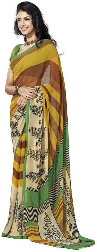 There?s nothing better that can beat the rich, elegant style that a traditional saree add to your look. Check out this cream, yellow and coffee colored saree from Fabdeal that features fine printed design and sequin work. Made from faux georgette fabrication, this saree is lightweight and so is very easy to carry, while you enjoy any special occasion. Team it up with antique jewellery and matching sandals for added attraction.