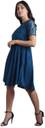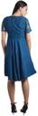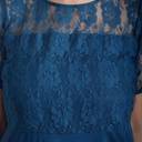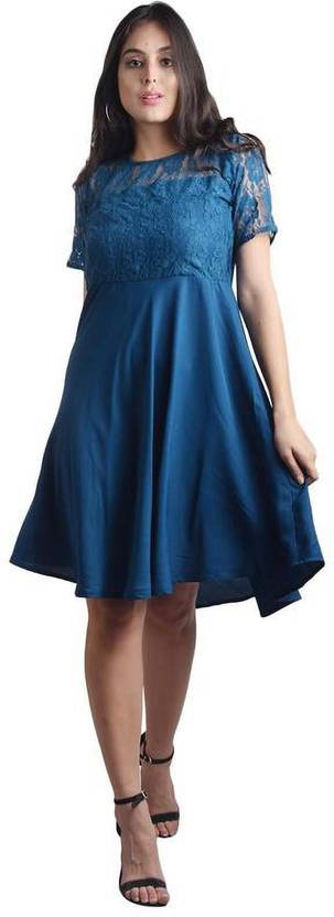 women Teal bue net lace self design mini short dress has a Boat neck,gathered on waistline ,zipper detail in back side and flayered hem.