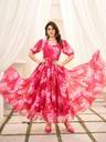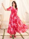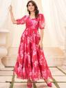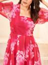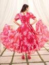 This exquisite gown is a celebration of timeless elegance and vibrant femininity. Crafted from a luxurious, lightweight fabric, the gown boasts a radiant red-pink hue, adorned with delicate floral prints in soft shades of pink and white. The dress features a gracefully flared silhouette that flows with every movement, creating a captivating visual impact.