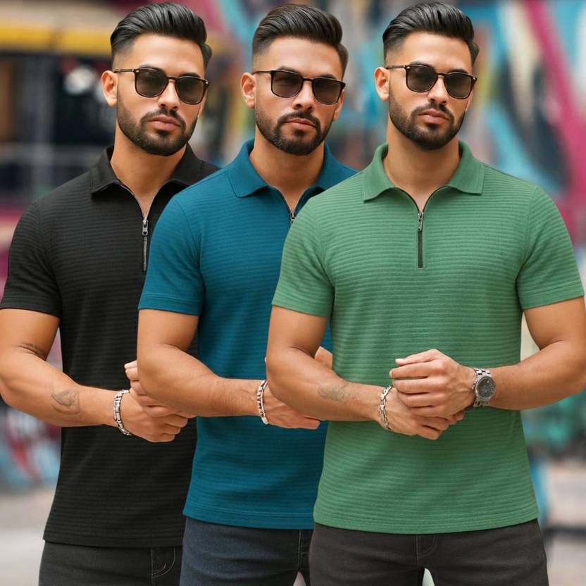 Fabflee Pack of 3 Men Solid Zip Neck Polycotton Multicolor T-Shirt