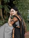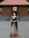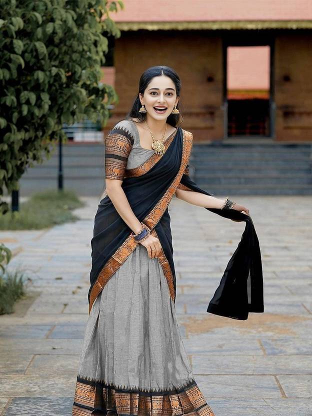 A wonderful cotton half saree in pretty shades of Grey Black . The beautiful Grey skirt is adorned with a gold border paired with Grey blouse and a matching Black dhavani.