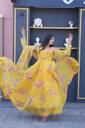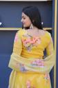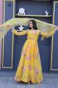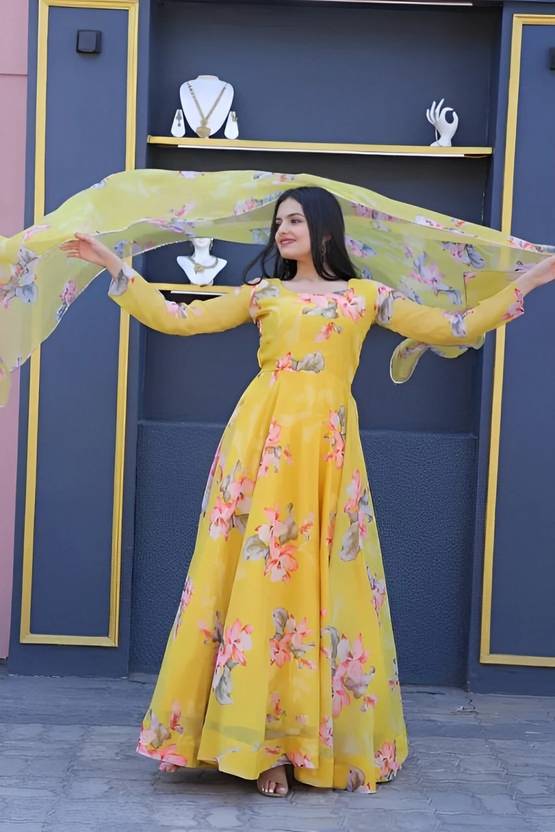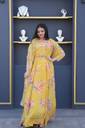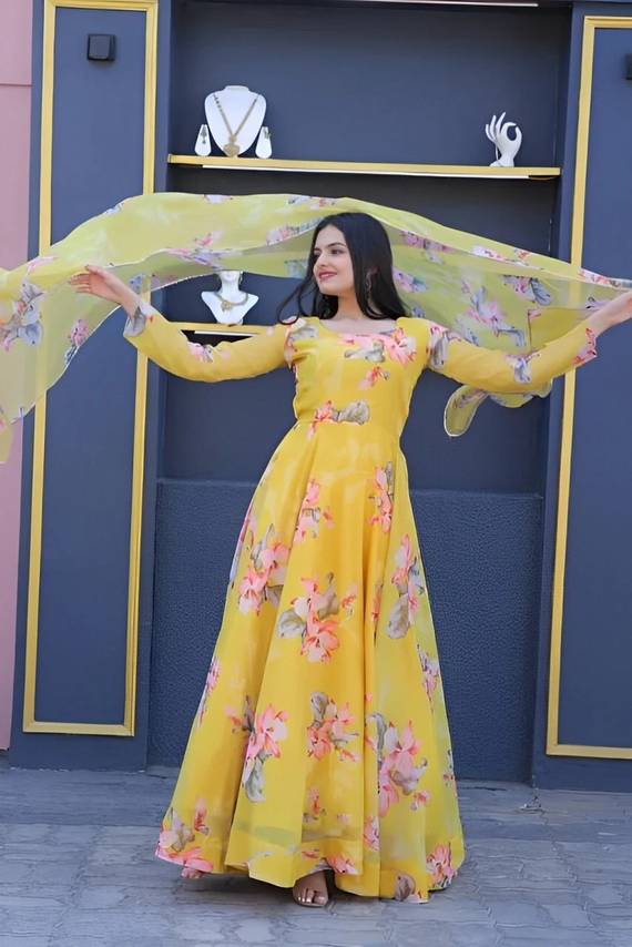 This charming ensemble features a vibrant yellow georgette gown paired with a matching dupatta, perfect for making a cheerful style statement. The gown is adorned with beautiful floral prints in shades of pink and green, giving it a lively and refreshing look. Its full-length design is complemented by flared long sleeves and a flattering neckline, creating an elegant yet playful vibe.