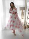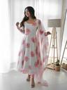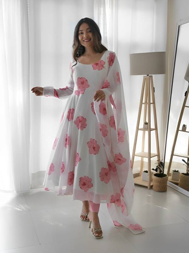 This outfit features a beautiful georgette fabric gown with a matching dupatta, both adorned with soft pink floral prints. The gown is lightweight, flowy, and semi-sheer, giving it an elegant drape and feminine charm. The georgette fabric adds a touch of breezy grace, making it perfect for both formal occasions and casual wear. The gown comes with a crepe inner lining, which provides a smooth and comfortable fit. The floral motifs scattered across the gown and dupatta create a vibrant yet delicate look. The dupatta, which drapes gracefully over the shoulder, completes the ensemble with a touch of traditional charm. Paired with simple, modern footwear, this outfit is ideal for women seeking a blend of classic elegance and contemporary style. Perfect for summer events, daytime gatherings, or festive celebrations.