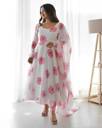 Gown Fabric: Georgette – Lightweight, sheer, and flowy fabric that gives the outfit an elegant fall and a comfortable feel., Fit: The gown has a flared, A-line silhouette, which suits a variety of body types, providing a flattering and graceful look., eckline: The gown has a round neckline, Dupatta: The matching dupatta comes with subtle detailing on the borders, which complements the gown.