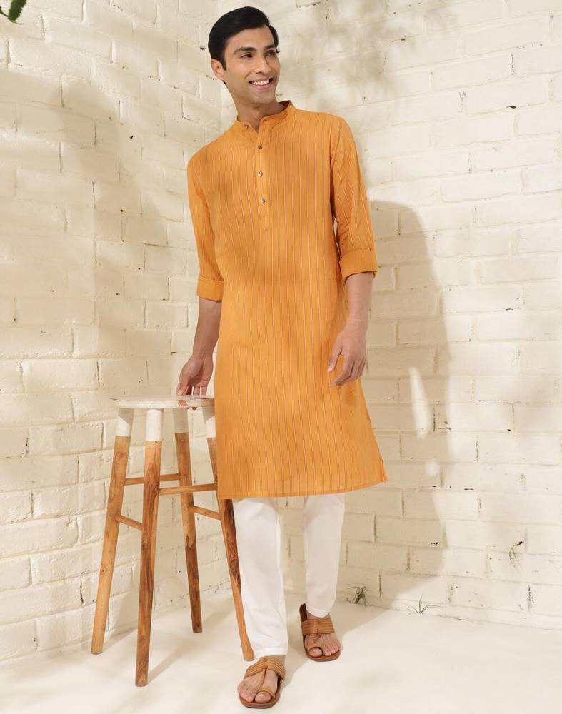Fabindia Men White Long Sleeves Mandarin Collar Pure Cotton Kurta Set