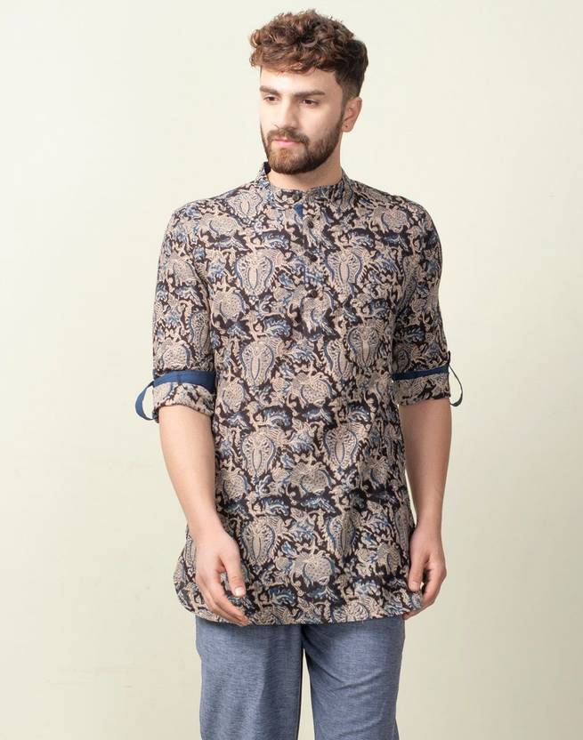 This full sleeve short Kurta sets the style trends of the season Crafted in cotton, it features Chinese collar and Kallmkari printed designs that lend it a classic touch in a chic way.
