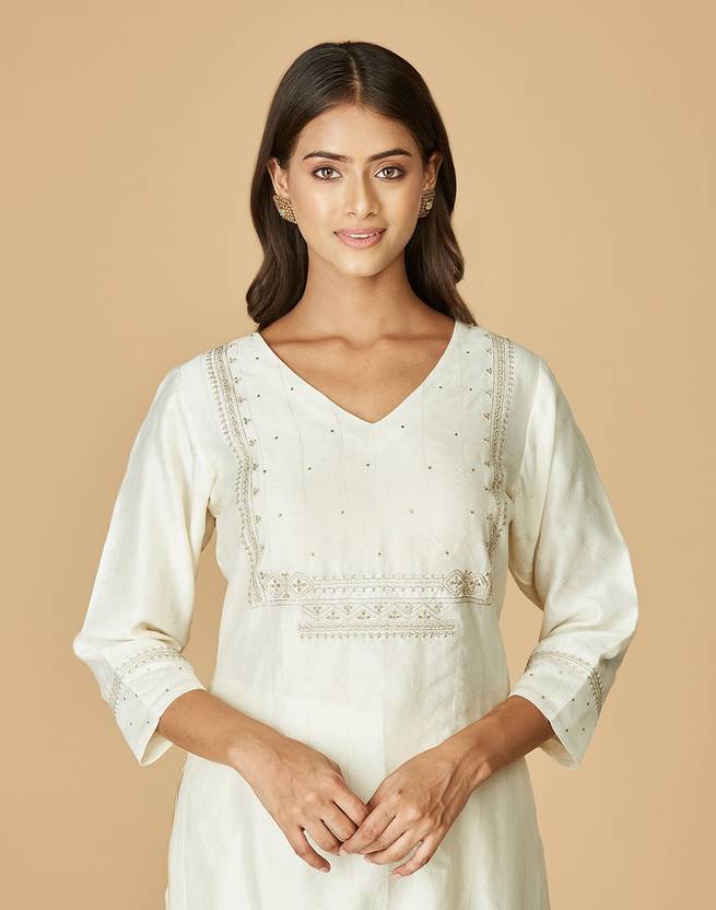 Fabindia Women Embroidered Cotton Silk Straight Kurta (White)