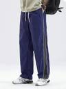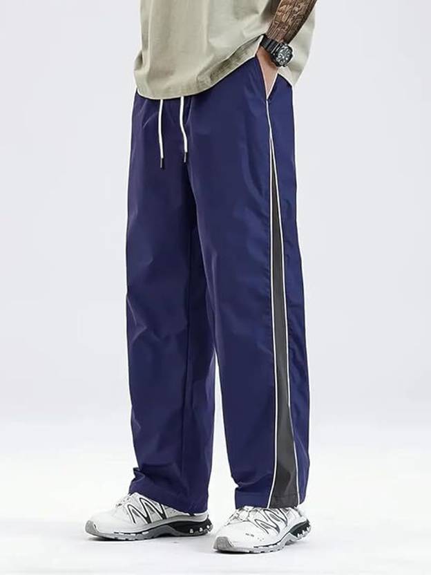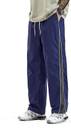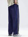 These comfortable navy blue track pants feature a relaxed fit, perfect for casual wear or light athletic activities. They are designed with a white drawstring waist for an adjustable fit and a distinctive black and white stripe running down the side of each leg, adding a sporty touch. The pants also include practical side pockets.