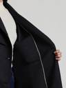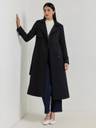 Double-breasted black trench coat with a spread collar, button closure, and a belted waist. Features a lined interior and three functional pockets.