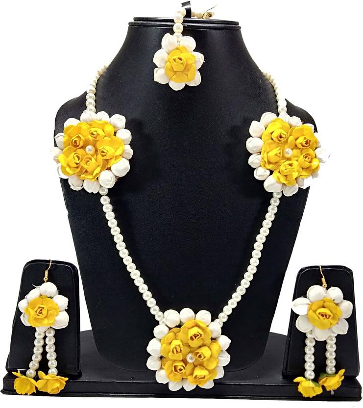 The elegant & ethnic necklace set is delicately hand crafted with gota patti . A base of yellow color superior quality product is used in the jewellery making . This will perfectly compliment your ethnic Indian wear as well . The necklace set give a rustic yet traditional look. This Beautiful set is suitable for all occasion like Mehendi, Haldi, Baby-shower, pre-wedding. one biggest advantage of this jewellery is very light weight so you can wear it for hours.