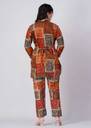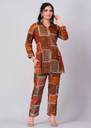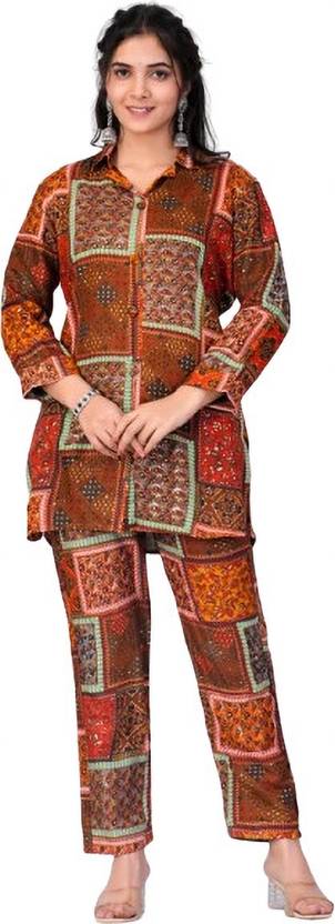 This stylish co-ord set features a vibrant patchwork-inspired print in warm earthy tones. The set includes a button-down shirt with a relaxed fit and full sleeves, paired with matching straight-leg pants for a comfortable yet chic look. Perfect for casual outings or festive gatherings, this ensemble combines tradition with modern elegance.