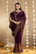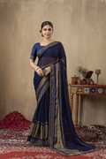 Featuring an elegant pattern, this women's saree is embellished with eye-catching Swarovski crystals, adding a subtle sparkle to the fabric. The intricate design creates a sophisticated appearance, ideal for special occasions. The border is highlighted by a beautifully crafted lace, giving the saree a refined and timeless look. These details enhance the overall aesthetic, making the saree an ideal choice for those who appreciate fine craftsmanship and delicate embellishments.