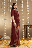Boasting a georgette material, this saree provides a flowing, lightweight feel that drapes beautifully. The soft texture of the fabric ensures ease of movement, making it comfortable to wear throughout the day or evening. The breathable material helps keep you comfortable while exuding an elegant and graceful silhouette.