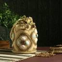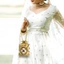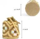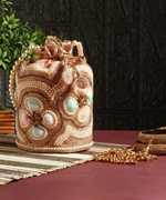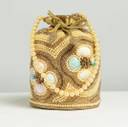 Material: High-quality synthetic fabric with detailed golden embroidery., Handle: Pearl-beaded handle for a regal look., Inner Material: Smooth satin fabric for a luxe feel., Closure Type: Drawstring with golden tassel detailing.