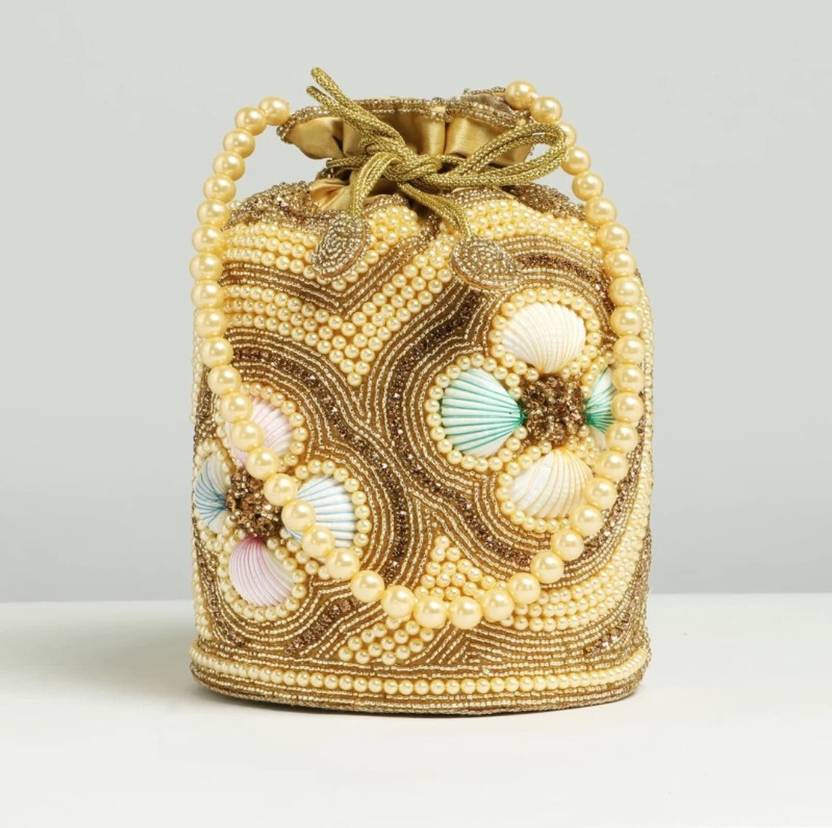 Embrace the charm of timeless elegance with this Pearl Shell Glam Potli Bag. Meticulously handcrafted, this bag features intricate pearl embellishments combined with pastel-colored shell accents that create a mesmerizing wave-like pattern. Its drawstring closure with a golden tassel offers both convenience and style. Perfect for weddings, festive occasions, or as a standout accessory, this potli exudes sophistication and grace.