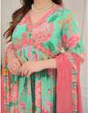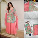 Offering an embroidered pattern and solid patterned pants, this women's kurta, pants, and dupatta set showcases a harmonious blend of artistry and sophistication. Also, the intricately embroidered pattern on this kurta adds a touch of ethnic charm, while the solid patterned pants contribute to a contemporary and elegant look.