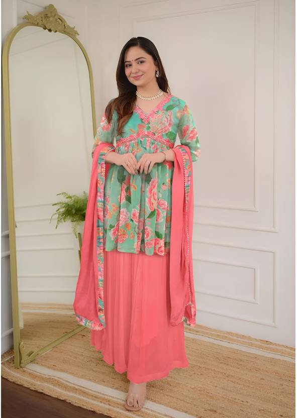 New Collection printed engagement dress date night winter wedding embroidary office casual designer indian bollywood kurta pant set,kurti pant duppata set, Diwali fastival suit flowers Embroidary work silk panjabi suit womens kurta with printed dupatta and pant 2024-25 (Kurti,Trouser,Duppata)