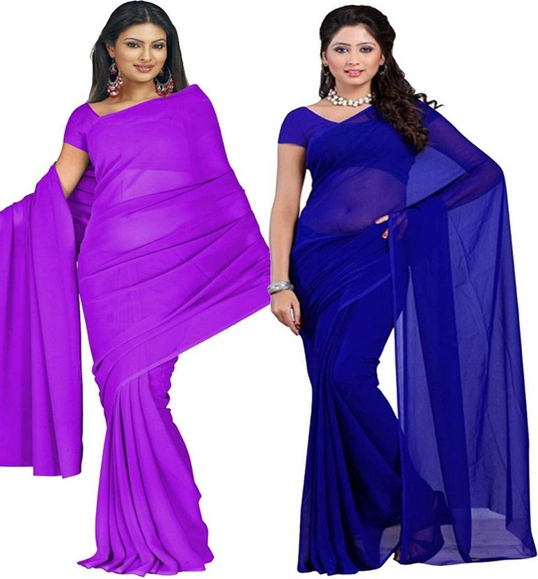 FANCYNINE Dyed Medium Purlpe and Royal Blue Saree With Unstitched Blouse & Saree Fabric - Georgette, Blouse - Georgette, with Length of Saree - 5.5,Blouse - 0.8