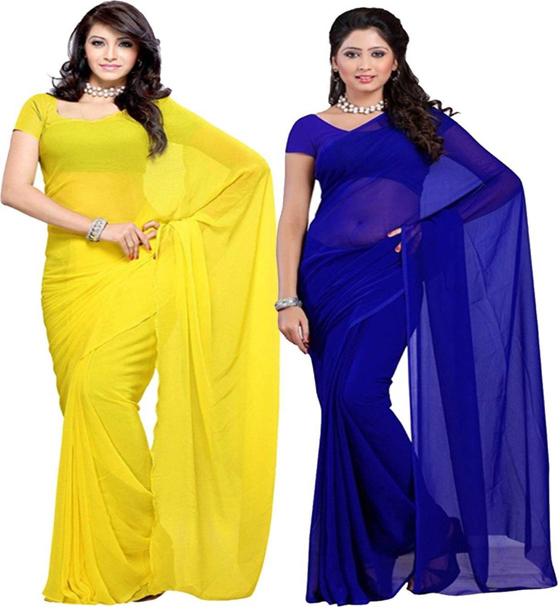 FANCYNINE Dyed Yellow and Royal Blue Saree With Unstitched Blouse & Saree Fabric - Georgette, Blouse - Georgette, with Length of Saree - 5.5,Blouse - 0.8