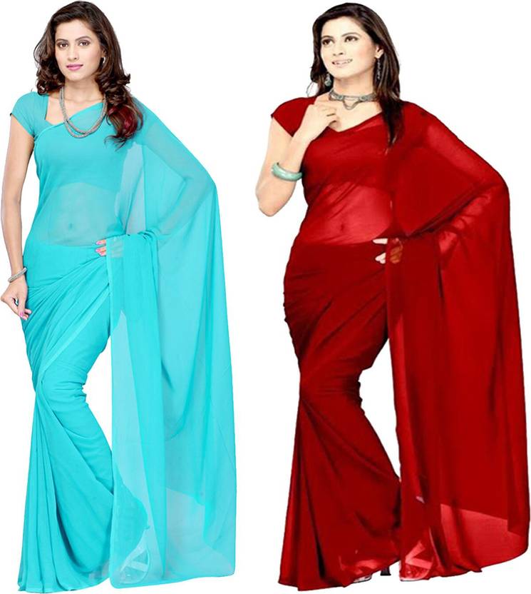 FANCYNINE Dyed Medium Turquoise and Crimson Saree With Unstitched Blouse & Saree Fabric - Georgette, Blouse - Georgette, with Length of Saree - 5.5,Blouse - 0.8