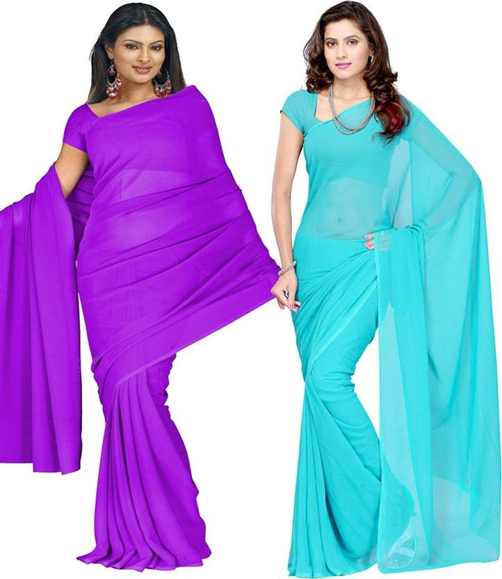 FANCYNINE Dyed Medium Purlpe and Medium Turquoise Saree With Unstitched Blouse & Saree Fabric - Georgette, Blouse - Georgette, with Length of Saree - 5.5,Blouse - 0.8
