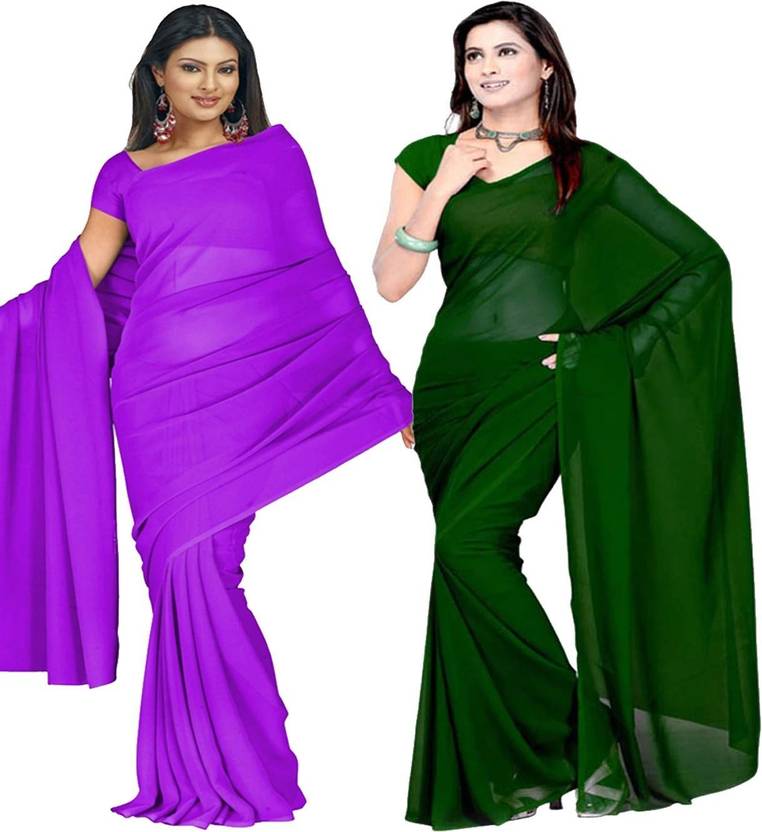 FANCYNINE Dyed Medium Purlpe and Dark Green Saree With Unstitched Blouse & Saree Fabric - Georgette, Blouse - Georgette, with Length of Saree - 5.5,Blouse - 0.8