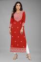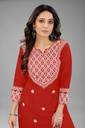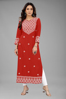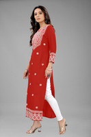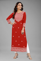 Owing to the gorgeous embroidered touch added throughout the front of the kurta, it can be worn for a stand out fashion appeal. This thread based embroidery has been skillfully stitched into the kurta fabric with a finesse that cannot go amiss. Made in a vibrant colour, the additional texture gives the clothing a fine appeal. The three fourth sleeves in the kurta frame make it a modest clothing option that can be worn by women of all ages whether middle aged, older, or younger.