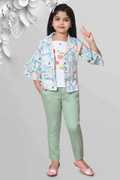 The mint green pants for girls bring that trendy vibe, pairing effortlessly with the playful floral jacket 🌿. The jacket, by the way, has ruffle sleeves that give a cool flair, while the graphic top adds an extra layer of cuteness 🦋! Your girl will stand out whether she's wearing it to a family gathering, birthday party 🎉, or even just hanging with friends.