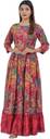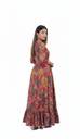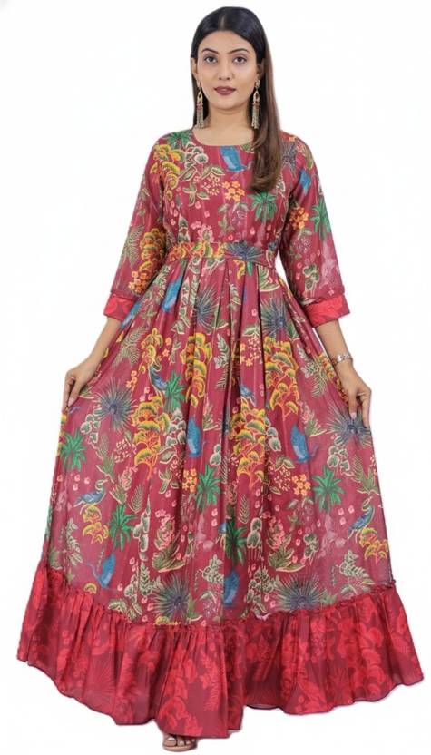 Step into effortless elegance with this vibrant red floral maxi dress from Fascino Designs. Crafted with a flowy silhouette and soft fabric, this full-length gown features 3/4th sleeves, a round neckline, and a flared hem with ruffle detailing for a chic yet feminine touch.