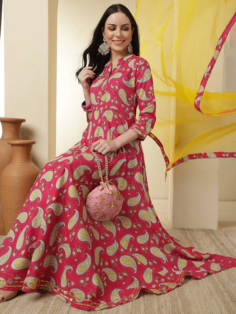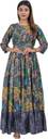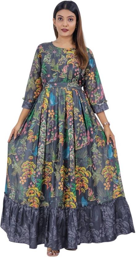 Elevate your wardrobe with this chic green floral maxi dress from Fascino Designs. Designed with a flowy, floor-length silhouette, this gown features 3/4th sleeves, a round neckline, and a stylish ruffled hem for a blend of elegance and comfort.