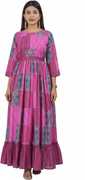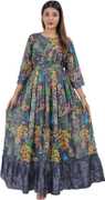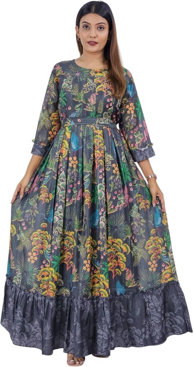 🌿 Elegant Maxi Dress: Full-length gown with floral & peacock prints.