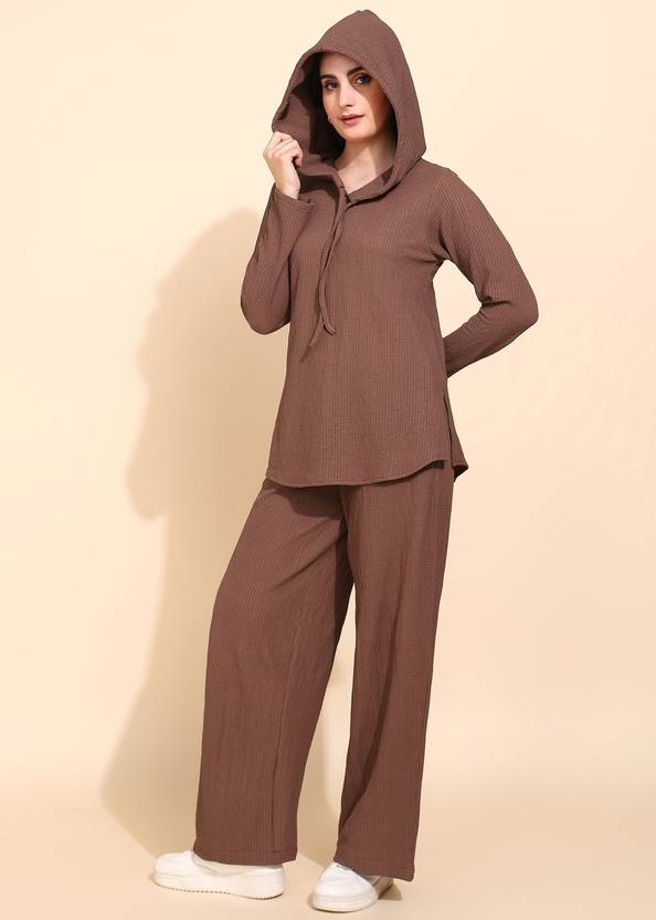 Stay effortlessly stylish with this Rust Brown Cord Set, crafted from textured fabric for a trendy yet comfortable look. The long-length top features a cozy hooded neck and full sleeves, adding a modern, laid-back vibe to your wardrobe.The matching pants come with an elasticated waist for a snug fit, while the both-side pockets ensure practicality and convenience. Perfect for casual styling, this cord set is a versatile choice for relaxed outings, travel, or lounging in style.Pair it with sneakers for a cool, casual look or layer it up for a chic, on-the-go ensemble.