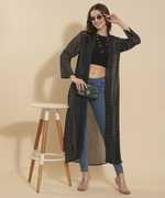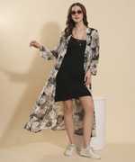 Make a bold style statement with this Black Multicoloured Big Floral Printed Long Shrug, designed to elevate any outfit. Crafted from chiffon fabric, it provides a light and airy feel, perfect for layering throughout the year.The long length and full sleeves offer an elegant, flowing silhouette, while the front open design allows for easy movement and versatile styling. The flared hem adds a graceful touch, creating a flattering shape as you move.The large floral print in vibrant colors against the classic black background brings a modern yet timeless appeal, making this shrug a perfect addition to any wardrobe for both casual and evening wear.