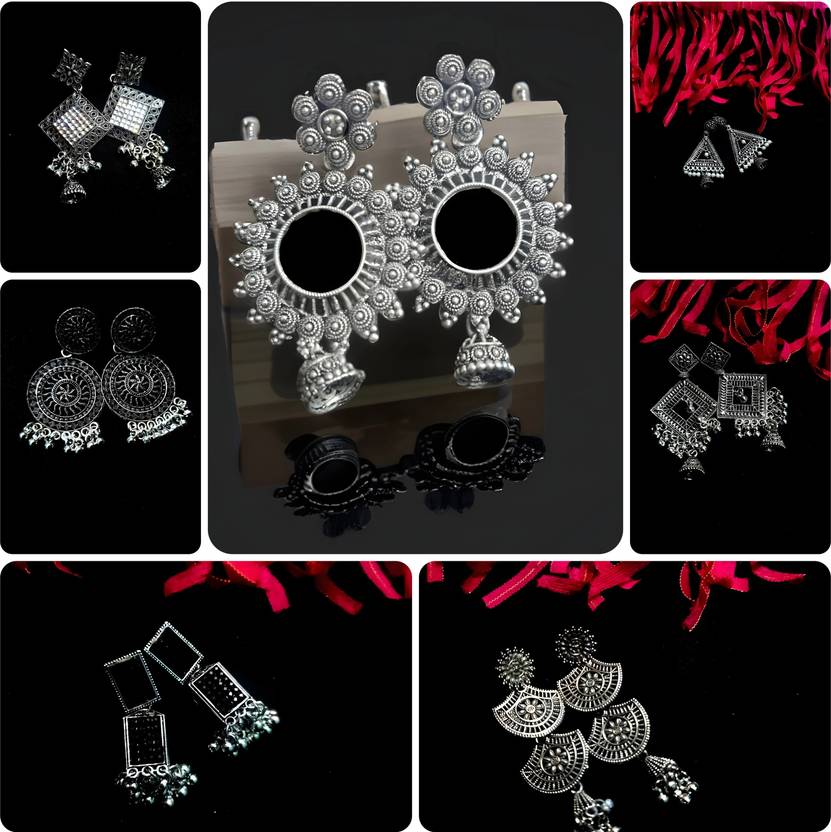 oxidised earrings jhumki silver combo set party stylish simple small jhumka 7 set Beads, Pearl, Cubic Zirconia, Diamond Brass, Enamel, Copper, Zinc, Stone Drops & Danglers, Chandbali Earring, Earring Set, Jhumki Earring