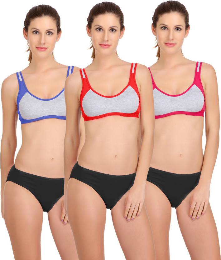 Sports Bra & Panty Set is perfect for exercising, gym,walk ,aerobics or yoga. Soft wide straps , linning for maximum support & comfort .Modern styling with wide arm holes provides complete freedom of movement. It has a high back and full coverage which is perfect gym wear .The Fresh coloured panty has elasticized waist bands and leg hole which is comfortable. Cross back styling with wider armholes. Made of cotton elastin stretch fabric providing superior comfort and stretch. Full figure with an elasticated band that allow you to slip into them with ease and assures a firm fit.