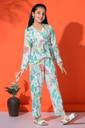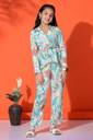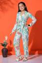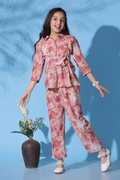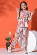Our new summer collection for your girls brings this stylish printed co-ords set. This multi color top and pant set for girls is made of capsule fabric, which is lightweight and comfortable to wear, and decorated with beautiful all over printed. The western top for kids features a lapel collar neck, front button placket, separate self-fabric belt for tie-up, long cuffed sleeves, and high-low hemline. Furthermore, the top in this set comes with pant bottom that has ankle length and fully elasticated waistband for a comfortable fit. Style her with favorite sneakers or sandals to complete a casual yet fashionable look. Enjoy this summer season with this easy breezy clothing set.