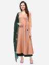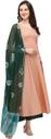 The Anarkali design features a flattering A-line cut, accentuating your figure while providing ample room for movement. The kurta is adorned with intricate prints that add a touch of vibrancy and elegance, capturing the essence of traditional Indian attire. The peach base is beautifully contrasted by the rich green of the dupatta, which adds a layer of sophistication and charm.
