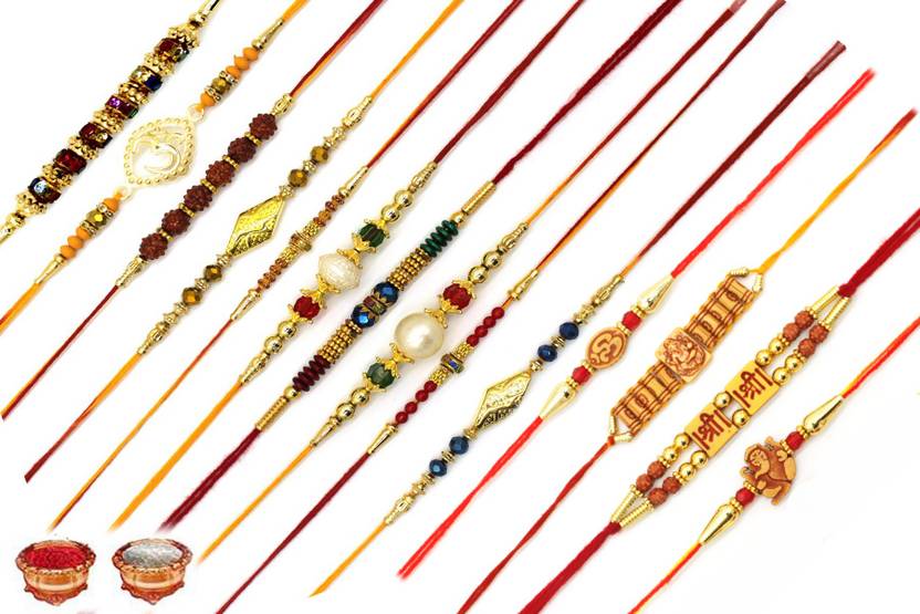 Fashion Factory Designer RK-N2+N4TON13-N15TO17-14P-RC Mauli Thread Rakhi Set (Pack of 14 Rakhi , 1 Pack Roli Chawal)