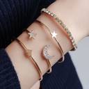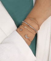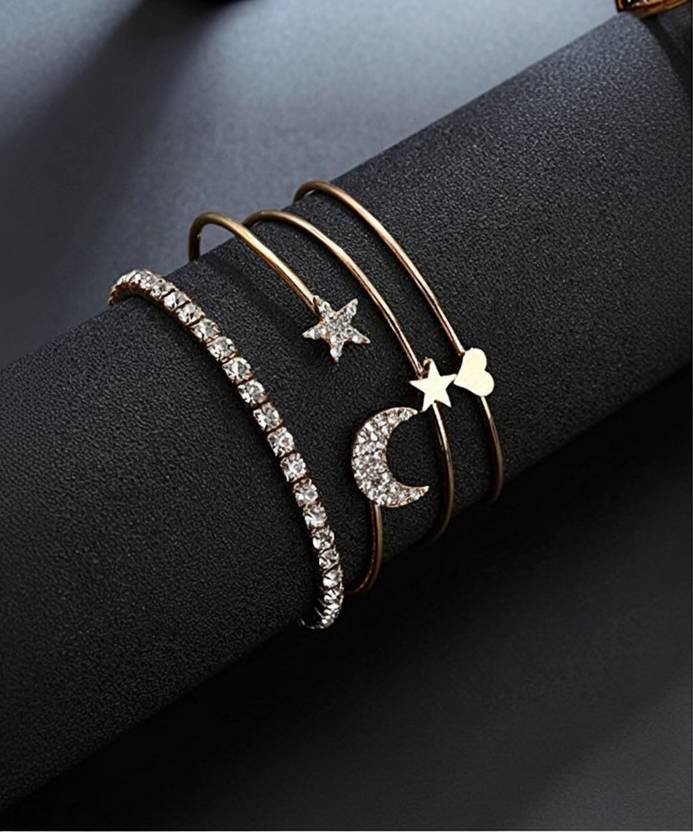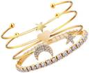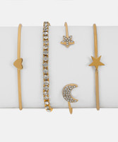 This set of bracelets, each one distinctive in its own right but all exquisite together, is a representation of classic beauty. Every bracelet in this gorgeous line has unique embellishments. The first has a brilliant shine thanks to cubic zirconia. The second has a heart, which stands for adoration and love. A half-moon and star adorn the third, inspiring awe. The fourth bracelet has a focal star that glows, signifying brightness.