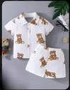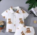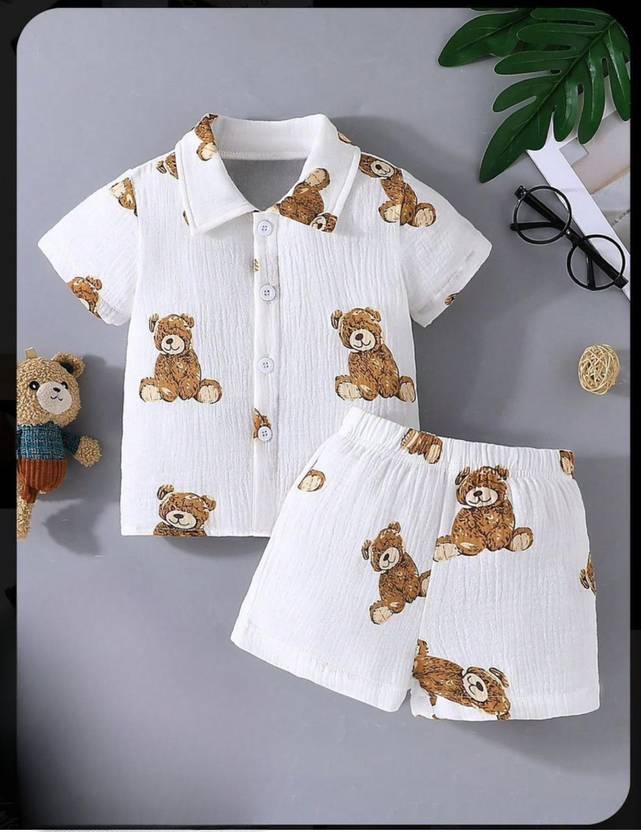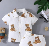 Featuring a charming bear print, complemented by a solid base pattern, this boys' shirt and shorts set can add a fun, adventurous vibe to your little one's wardrobe. Moreover, the solid base ensures a balanced, stylish look. So, whether for a casual outing or a day at the park, the combination might make him stand out in the crowd.