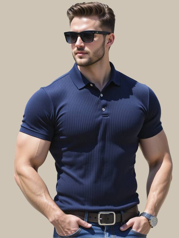 Fashion And Youth Men Solid Polo Neck Cotton Blend Navy Blue T-Shirt