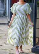 Sporting a stylish boat neckline and short butterfly sleeves, this dress ensures a relaxed and flattering fit. The practical length provides a playful flow while allowing ease of movement throughout the day. The fit-and-flare silhouette accentuates the waist and gives a graceful shape to this apparel. Therefore, designed for all-day wear, this dress combines style with practicality, making it ideal for different activities.