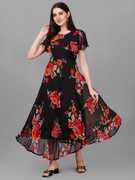 Sporting a full-length cut, this dress offers a flattering fit-and-flare shape that enhances your natural contours. The short flared sleeves provide a comfortable and airy fit, while the round neck maintains a clean, classic look. And, the well-balanced silhouette makes it suitable for a wide range of events, offering both style and ease of wear. Also, its flowy design ensures comfort throughout the day.