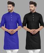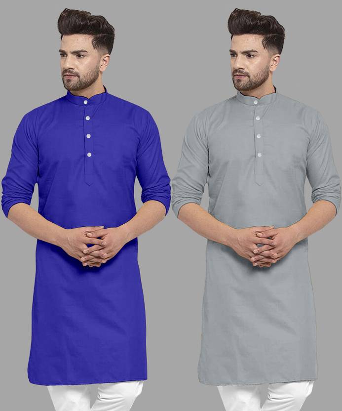 Pack of 2 Men Solid Cotton Blend Straight Kurta (Grey, Blue)