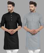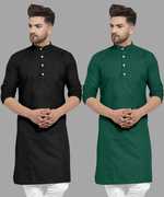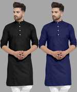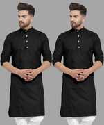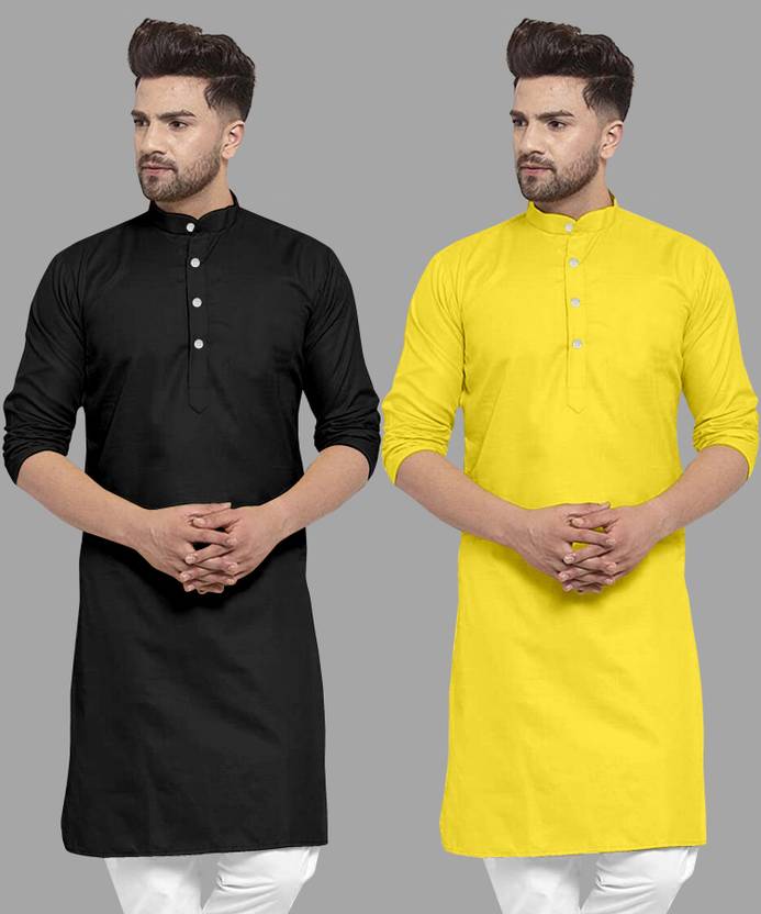Pack of 2 Men Solid Cotton Blend Straight Kurta (Yellow, Black)