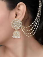 Boasting a graceful design, these women’s earrings come in a jhumka style combined with an ear cuffs chain. The inclusion of delicate pearl embellishments adds a touch of charm. Additionally, the detailing ensures they stand out while maintaining an elegant balance. Moreover, the chain style enhances the overall appearance, offering a refined look.