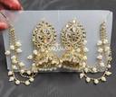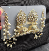 Boasting an elegant design, these women’s earrings bring together the timeless charm of chandelier earrings and the intricate beauty of kundan jhumkas. The addition of delicate pearl sahara chains enhances their appeal, creating a graceful and traditional look.