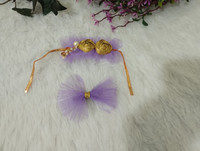 It comes with accessories that enhance the overall appeal of the skirt. It includes a hand accessory that can be tied to the wrist. The hand accessory has been designed with two beautiful rose flowers in a golden finish. The tie-up thread is adorned with elegant pearl-like embellishments which add to the elegance. The flowers are stitched to a similar net pattern cloth as the skirt, adding to the aesthetic of the outfit, making it look cohesive. It also includes a hair clip in a similar net pattern.